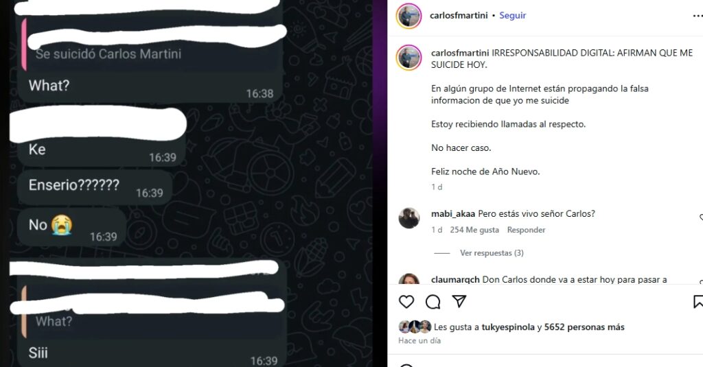 La versión, difundida sin sustento ni verificación, generó preocupación entre colegas, familiares y seguidores del comunicador, quien empezó a recibir numerosas llamadas y mensajes alertándolo sobre el contenido del rumor. Ante esta situación, Martini decidió aclarar el hecho de manera directa y pública para frenar la desinformación.