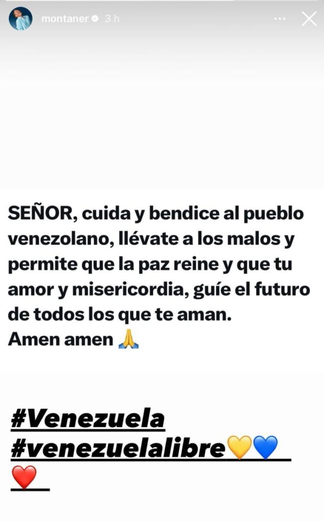 Apenas conocida la noticia, figuras del espectáculo venezolano comenzaron a pronunciarse en redes sociales. El cantante Ricardo Montaner fue uno de los primeros en manifestarse con un mensaje cargado de espiritualidad y esperanza, pidiendo protección para el pueblo venezolano y augurando un futuro de paz. Su publicación se viralizó rápidamente y generó miles de reacciones.