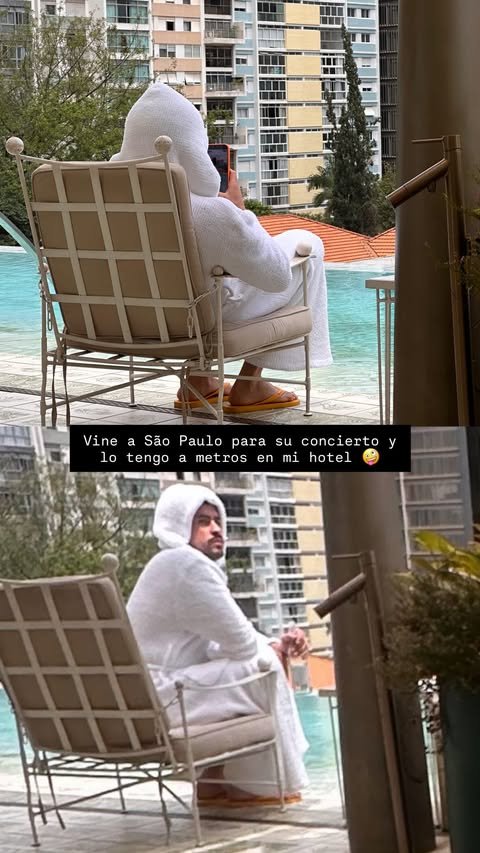 Según relató, el cantante disfrutaba de un momento de descanso, en bata y rodeado de un fuerte dispositivo de seguridad, cuando sus caminos coincidieron. Chiche optó por la prudencia, tomó algunas fotografías a la distancia, pero decidió no interrumpirlo para pedirle una selfie. “Entendí que estaba en su momento de relax”, comentó, destacando que prefirió respetar ese espacio privado.