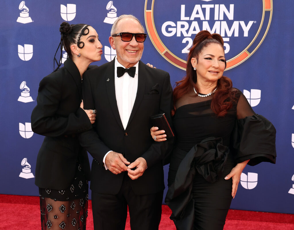 LAS VEGAS, NEVADA – NOVEMBER 13: (L-R) Emily Estefan, Emilio Estefan, and Gloria Estefan attend the 26th Annual Latin Grammy Awards at the MGM Grand Garden Arena on November 13, 2025 in Las Vegas, Nevada. (Photo by Tommaso Boddi/Getty Images for The Latin Recording Academy)