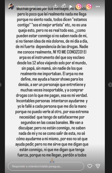 Minutos después, un amigo del artista utilizó la misma cuenta para llevar tranquilidad, explicando que ya se encontraban junto a él y que necesitaba apoyo. Sin embargo, por la noche Cristaldo volvió a escribir, agradeciendo los mensajes pero dejando en claro que nada lograba reconfortarlo. “Todos dicen que están conmigo, pero no saben nada de mí… ni yo me conozco”, expresó, revelando que continúa luchando contra una fuerte adicción a las drogas, una batalla que él mismo calificó como “perdida”.