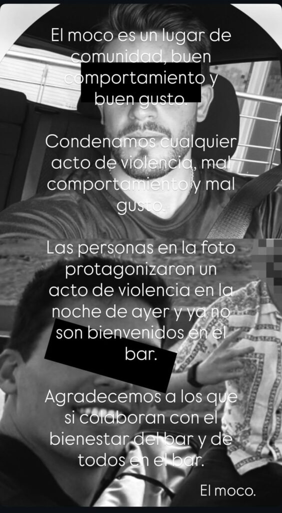 A través de un contundente comunicado publicado en su cuenta de Instagram, la administración de El Moco dejó en claro su postura: “El Moco es un lugar de comunidad, buen comportamiento y buen gusto. Condenamos cualquier acto de violencia, mal comportamiento y mal gusto. Las personas en las fotos protagonizaron un acto de violencia en la noche de ayer y ya no son bienvenidos en el bar”. Con estas palabras, el bar marcó una línea clara entre quienes suman y quienes restan a la experiencia colectiva del lugar.