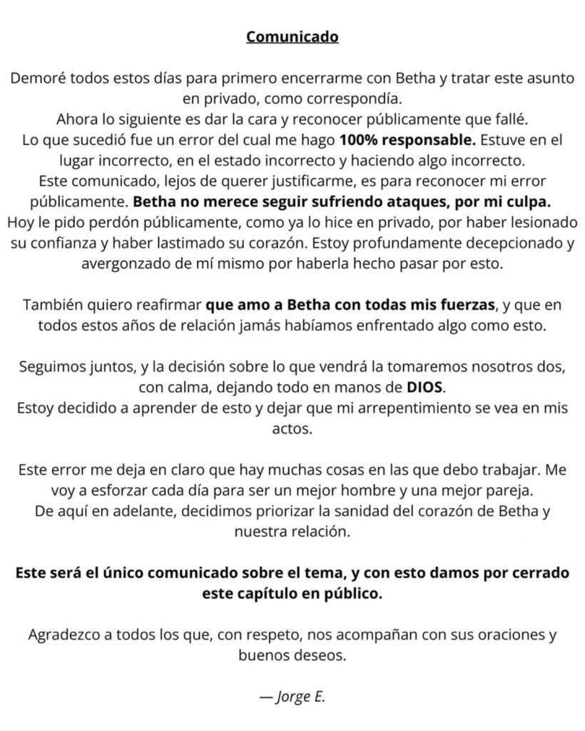 Con la intención de proteger su intimidad y priorizar su salud emocional, la pareja decidió cerrar el capítulo públicamente con este comunicado. Escobar aclaró que no volverá a referirse al tema y que, de ahora en adelante, optarán por el silencio como forma de sanar. Mientras tanto, las reacciones en redes sociales no se hicieron esperar, entre quienes aplauden su honestidad y quienes critican sus actos, el debate sigue encendido. Pero para Jorge, la decisión está tomada: seguir adelante, con humildad y puertas adentro.