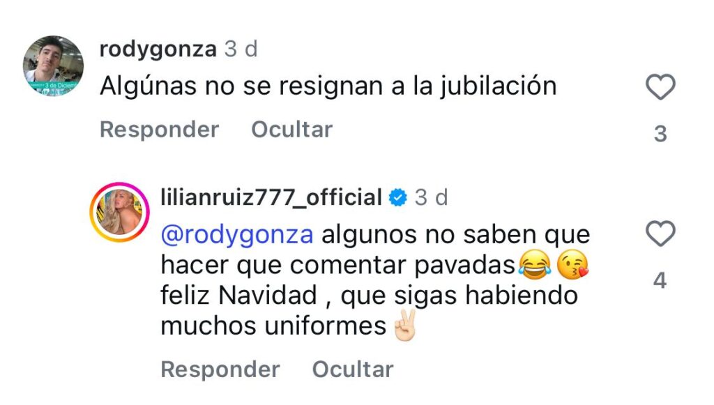 Lejos de quedarse en silencio, Lilian respondió con sarcasmo y emojis, fiel a su estilo directo. “Algunos no saben qué hacer que comentar pavadas. Feliz Navidad, que sigas habiendo muchos uniformes”, escribió, dejando en claro que no se siente afectada por las críticas y que seguirá diciendo lo que piensa, aunque eso genere polémica.