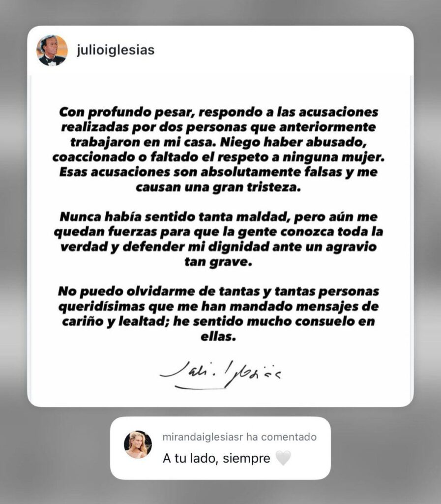 El respaldo no tardó en llegar desde distintos ámbitos. Figuras públicas y amigos cercanos salieron a expresar su apoyo, destacando el trato respetuoso que, según ellos, siempre caracterizó a Julio Iglesias. Mensajes de aliento y llamados a la prudencia se multiplicaron en medio de uno de los momentos más delicados de su vida pública, mientras el artista insiste en que la verdad será su principal defensa.