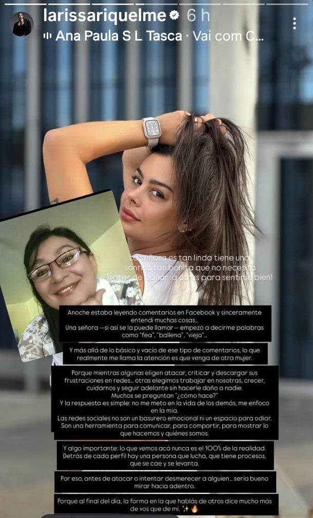 La modelo paraguaya Larissa Riquelme salió al paso de comentarios ofensivos que recibió en Facebook, luego de que una usuaria la calificara con términos despectivos. Lejos de reaccionar con agresividad, la también conocida como “Novia del Mundial” optó por contestar con un mensaje reflexivo, apuntando especialmente al hecho de que las críticas provinieran de otra mujer.