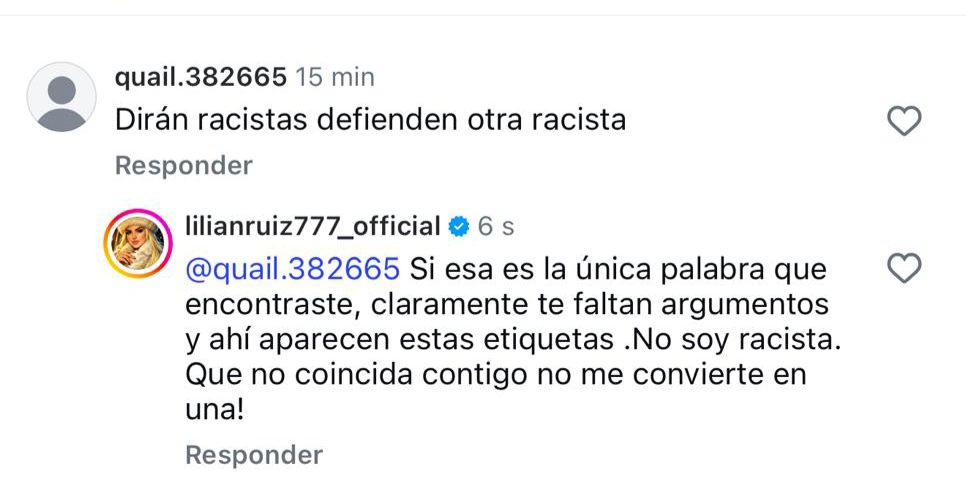 Sin embargo, la respuesta de Ruíz no se hizo esperar. Con la claridad y elegancia que la caracteriza, la modelo respondió directamente al usuario anónimo: “Si esa es la única palabra que encontraste, claramente te faltan argumentos y ahí aparecen estas etiquetas. No soy racista. Que no coincida contigo no me convierte en una”. Su mensaje no solo defendió su postura, sino que también dejó en evidencia la falta de fundamento de las acusaciones.