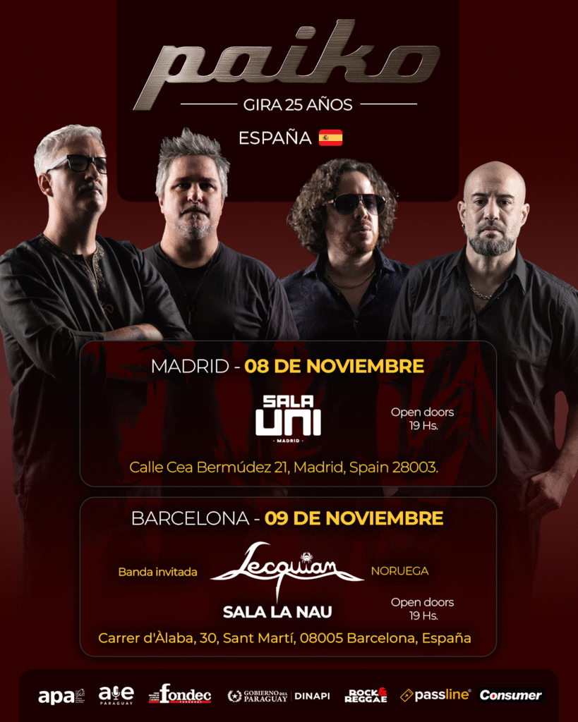 La icónica banda paraguaya Paiko prepara un regreso muy especial a tierras españolas, con dos conciertos imperdibles, el 8 de noviembre en Madrid (Sala Uni) y el 9 de noviembre en Barcelona (Sala La Nau). El cuarteto invita a todos sus seguidores, especialmente a la comunidad paraguaya y latinoamericana, a reencontrarse con su música en dos noches llenas de recuerdos, nuevas vibras y mucho rock hecho en Paraguay.