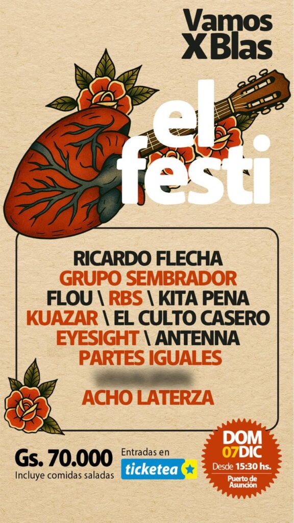 El próximo 7 de diciembre, desde las 15:30 h, el Puerto de Asunción se transformará en un espacio de solidaridad y música en vivo con la jornada “Vamos x Blas”, organizada para ayudar a cubrir los costos del tratamiento médico de Blas Rodrigo, cantante y compositor de bandas locales como Kita Pena y Ripe Banana Skins. Las entradas ya se encuentran a la venta a través de Ticketea por Gs. 70.000, que incluyen acceso al evento y comidas saladas; los postres y bebidas se abonarán por separado.