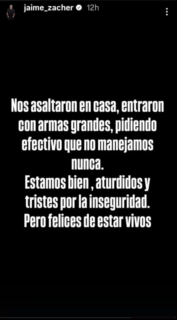 A través de sus redes sociales, Zacher relató lo vivido y expresó alivio por haber salido ilesos del ataque. “Entraron con armas grandes pidiendo plata que no manejamos. Estamos bien, aunque muy golpeados por lo ocurrido. La inseguridad duele, pero agradecemos estar vivos”, manifestó el músico, cuyo testimonio generó numerosas muestras de apoyo y solidaridad.