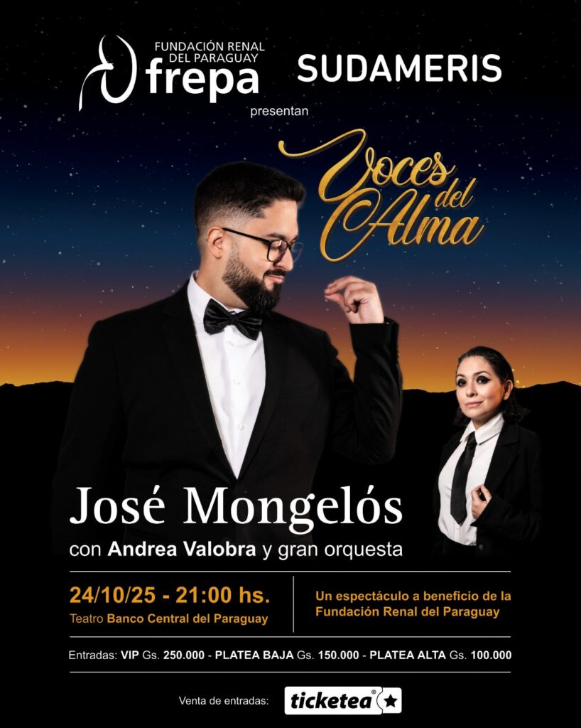 El espectáculo “Voces del Alma” llegará al escenario del Teatro José Asunción Flores el viernes 24 de octubre, con una propuesta que combina música, teatro y solidaridad. Inspirado en el formato de los grandes musicales de Broadway, el show será protagonizado por el tenor José Mongelós y la artista Andrea Valobra, quienes se unen para recaudar fondos en beneficio de la Fundación Renal del Paraguay (FREPA). Con una orquesta en vivo, más de veinte bailarines y una puesta en escena de alto nivel, la gala se proyecta como un encuentro donde el arte cobra sentido social.